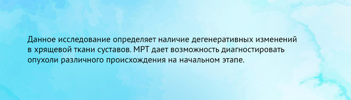 Магнитно-резонансная томография дает возможность определить вывихи, переломы, защемления и другие патологии. С помощью процедуры можно диагностировать врожденные аномалии в развитии суставов. Также, с помощью МРТ можно увидеть состояние связок, определить разрывы, что, к примеру, невозможно определить после проведения рентгена.